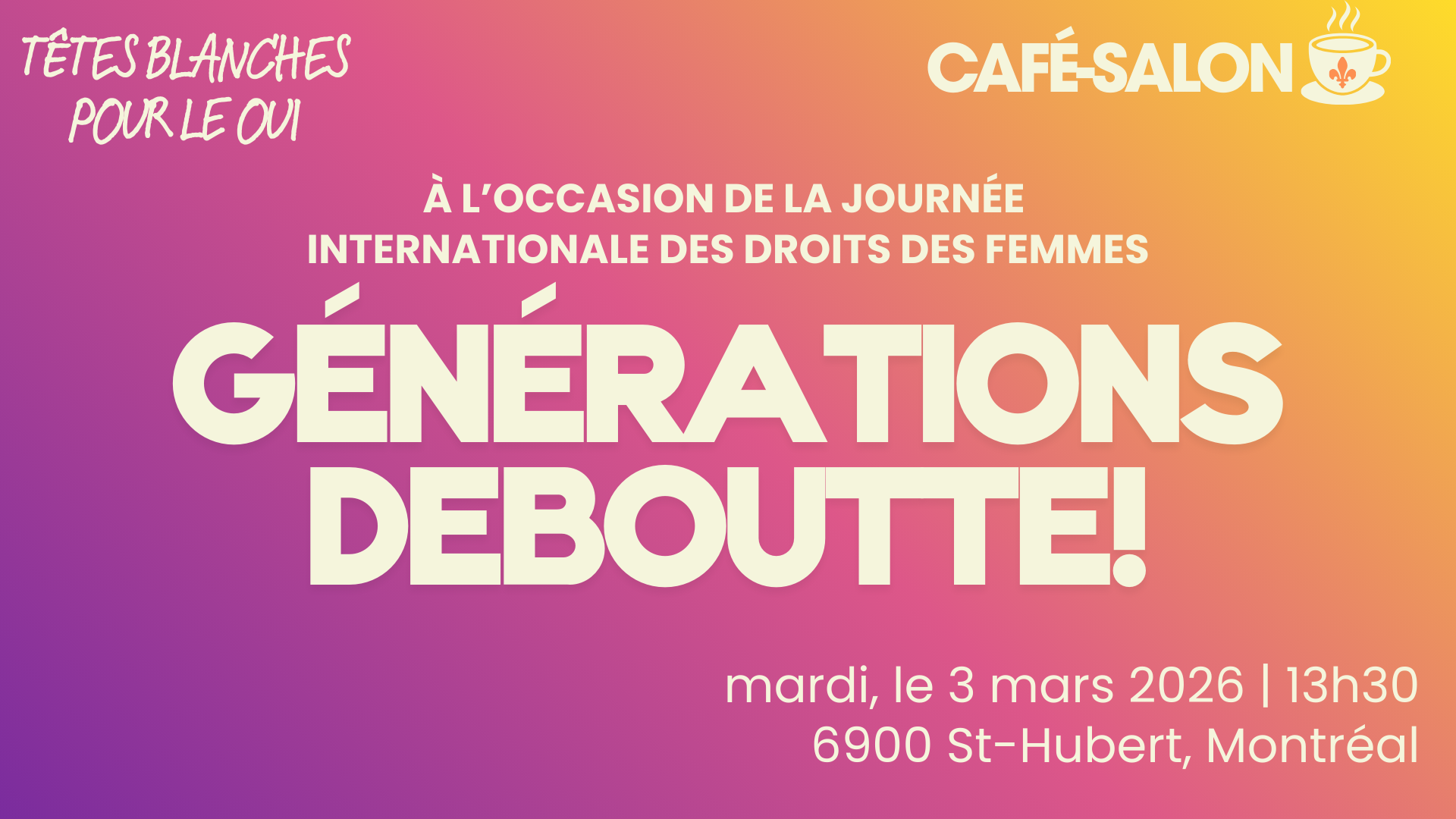 À l’occasion de la Journée internationale des droits des femmes, les Têtes blanches vous invitent le 3 mars prochain à un café-rencontre sous le thème mis de l’avant par le collectif 8 mars : GÉNÉRATIONS DEBOUTTE.